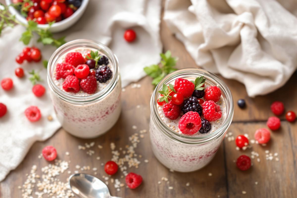 Le pudding de chia est connu pour sa simplicité et ses bienfaits nutritionnels. Les petites graines gonflent avec le liquide, créant une texture crémeuse en bouche. Il suffit de le préparer un peu à l’avance et le laisser reposer, le froid faisant le reste.
